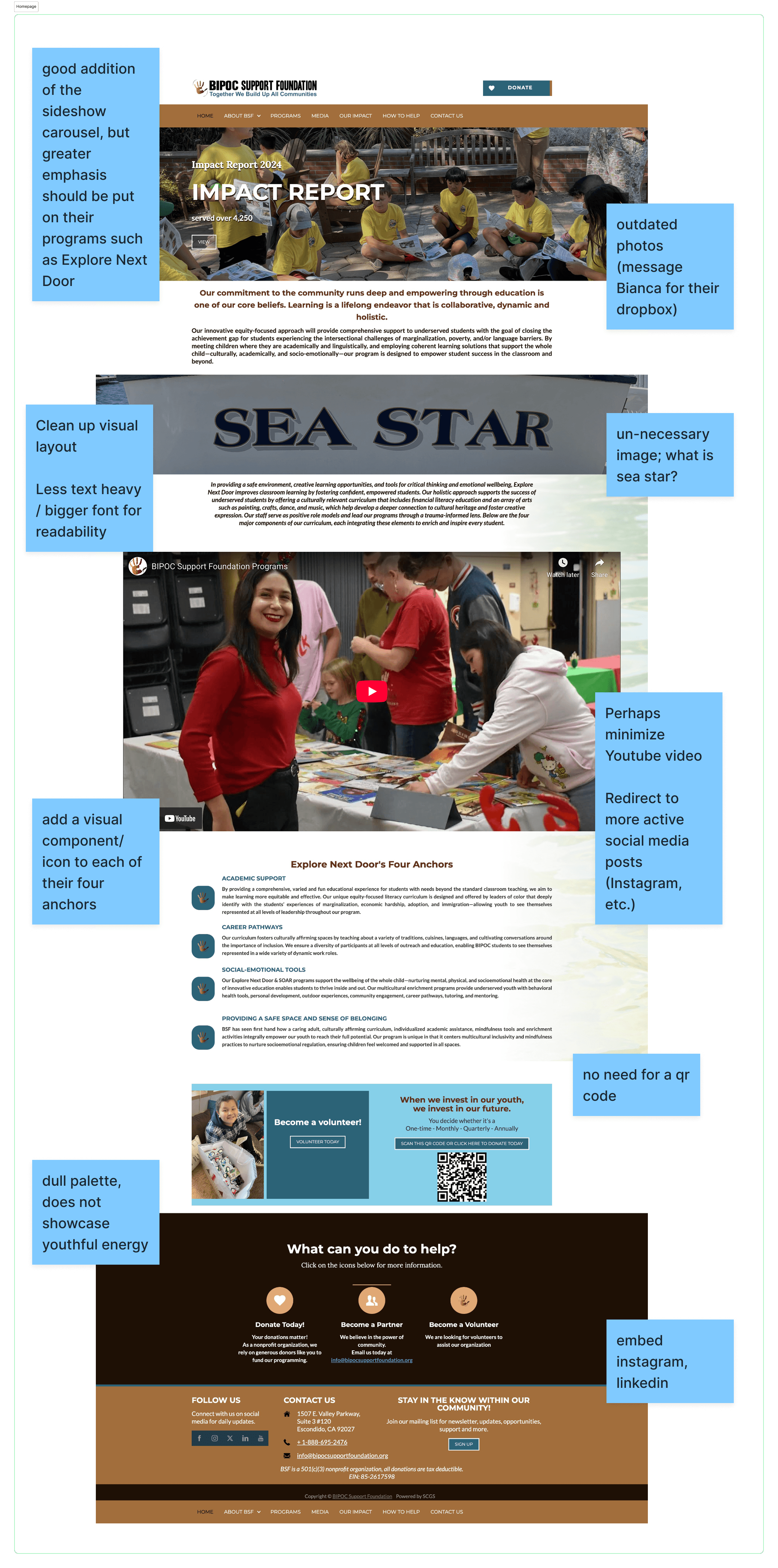 This project focused on a website redesign for the BIPOC Support Foundation (BSF), a non-profit organization that aims to empower the BIPOC youth community through equitable education and resources. They reached out to our team with the goal of making their website more accessible, readable, and reflective of their mission, as the existing website was outdated and did not accurately reflect its recent milestones or current initiatives.
