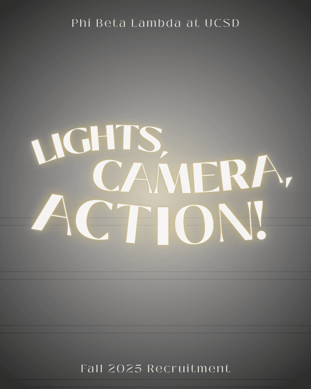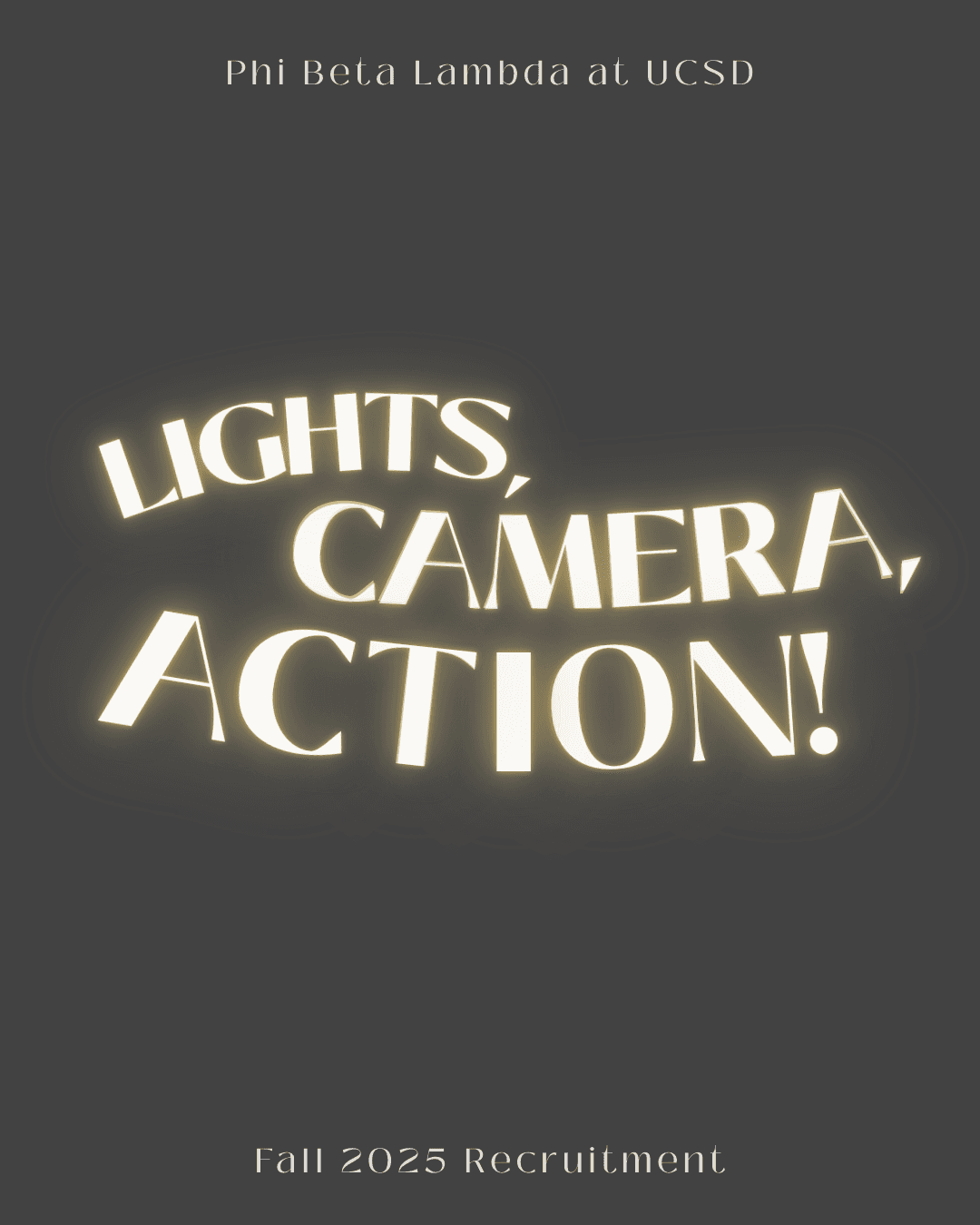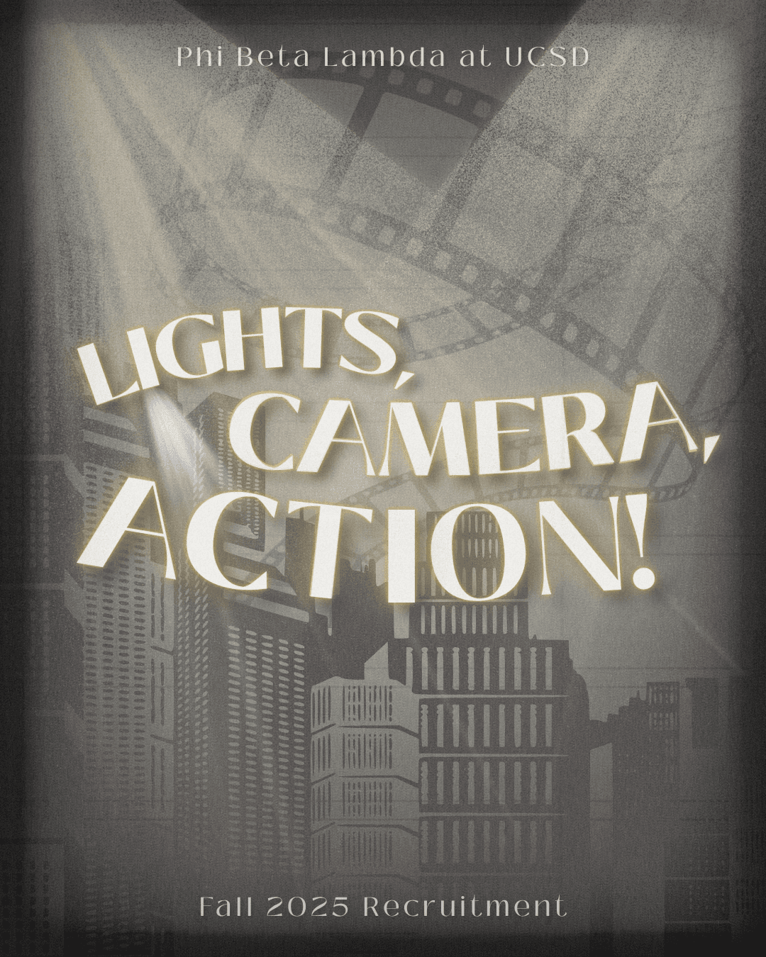 For UCSD Phi Beta Lambda's Fall 2025 recruitment campaign, I was in charge of designing our chosen theme of “Lights, Camera, Action!"; a lively concept designed to encapsulate the excitement of the new academic year through movie set elements and Hollywood visuals. Building on this direction, I designed a cohesive set of branded graphics to bring the theme to life, including a teaser video, theme reveal, recruitment timeline, and an informational guide outlining the organization’s purpose for prospective members.