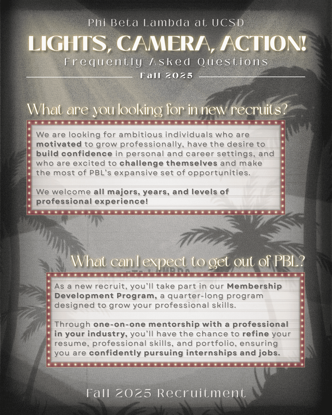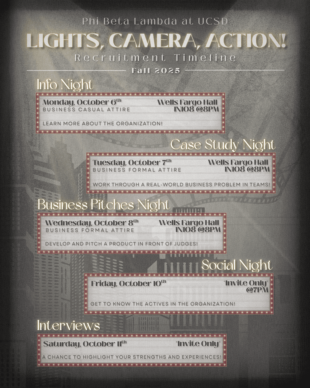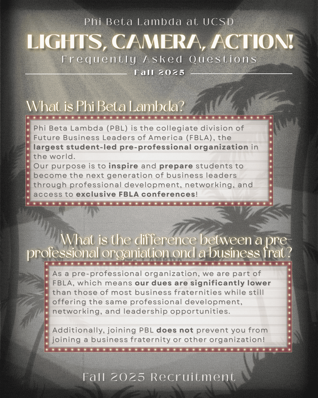 For UCSD Phi Beta Lambda's Fall 2025 recruitment campaign, I was in charge of designing our chosen theme of “Lights, Camera, Action!"; a lively concept designed to encapsulate the excitement of the new academic year through movie set elements and Hollywood visuals. Building on this direction, I designed a cohesive set of branded graphics to bring the theme to life, including a teaser video, theme reveal, recruitment timeline, and an informational guide outlining the organization’s purpose for prospective members.
